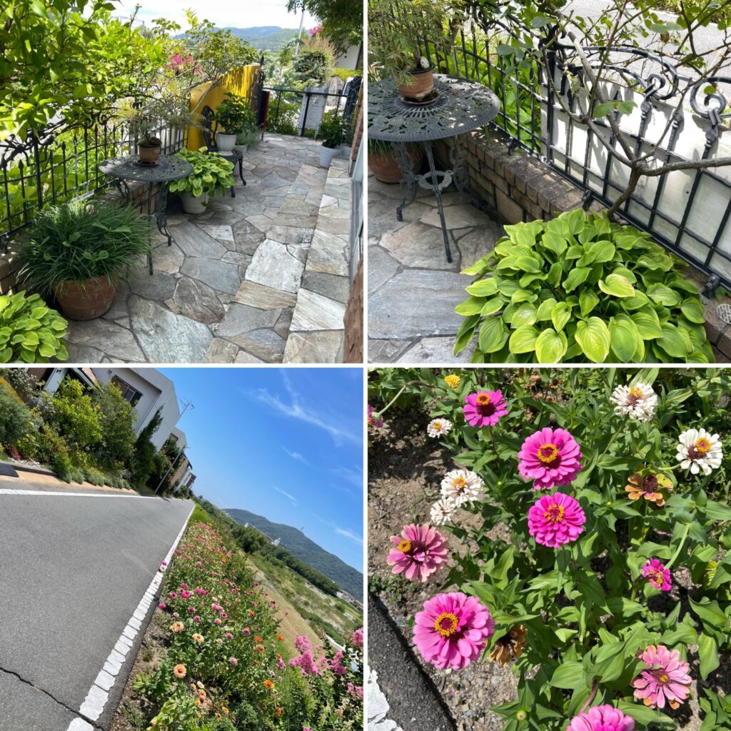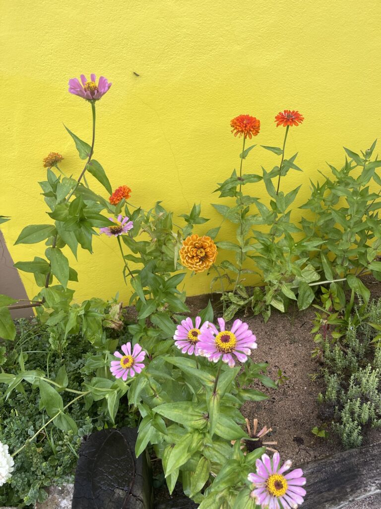 ザッパ村の黄色い壁の前で咲いてる百日草。