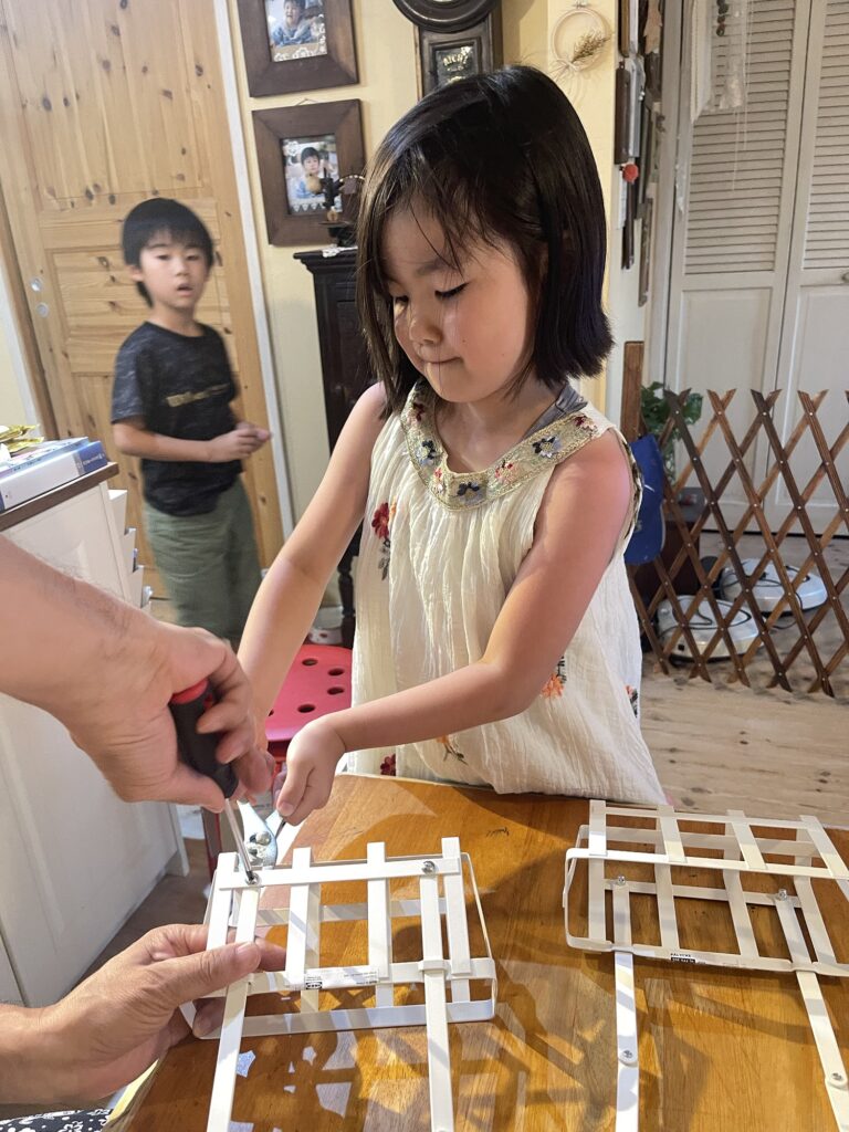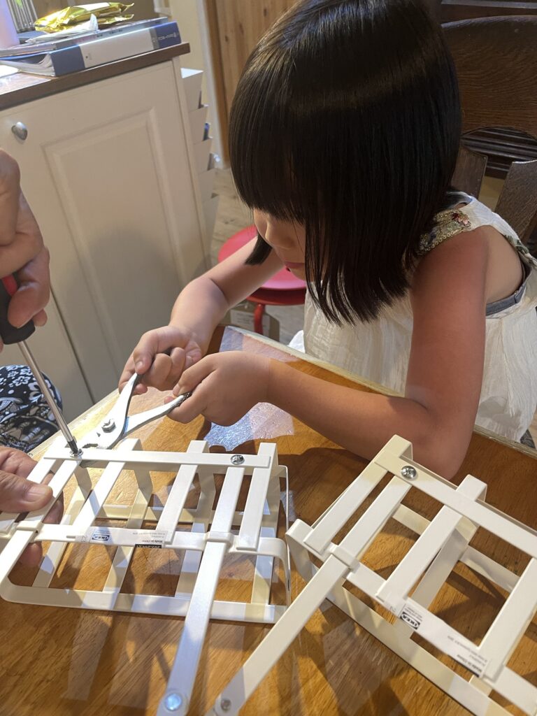 多肉を植えてぶら下げたら可愛いかなあと思って買った白いアイアンのカゴを、うーちゃんはじいちゃんと一緒に組み立てくれてます。