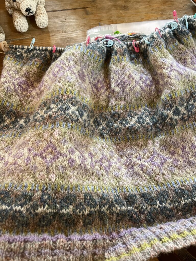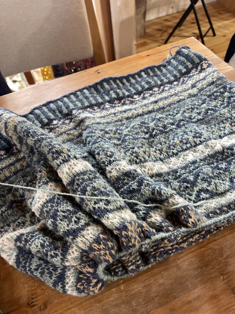 フェアアイルは初めてなのに、頑張って脇まで編んでこられました。