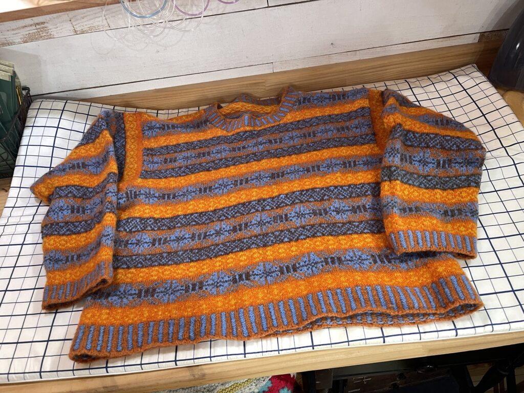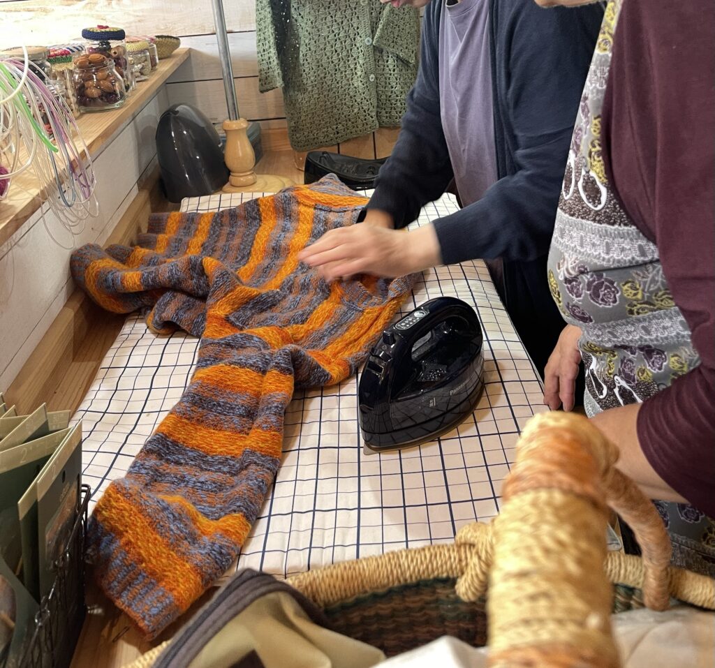 Kさんはオレンジと紺のポップな色合いで、素敵なセーターが編み上がり、蒸気アイロンのあて方を教えてもらってました。