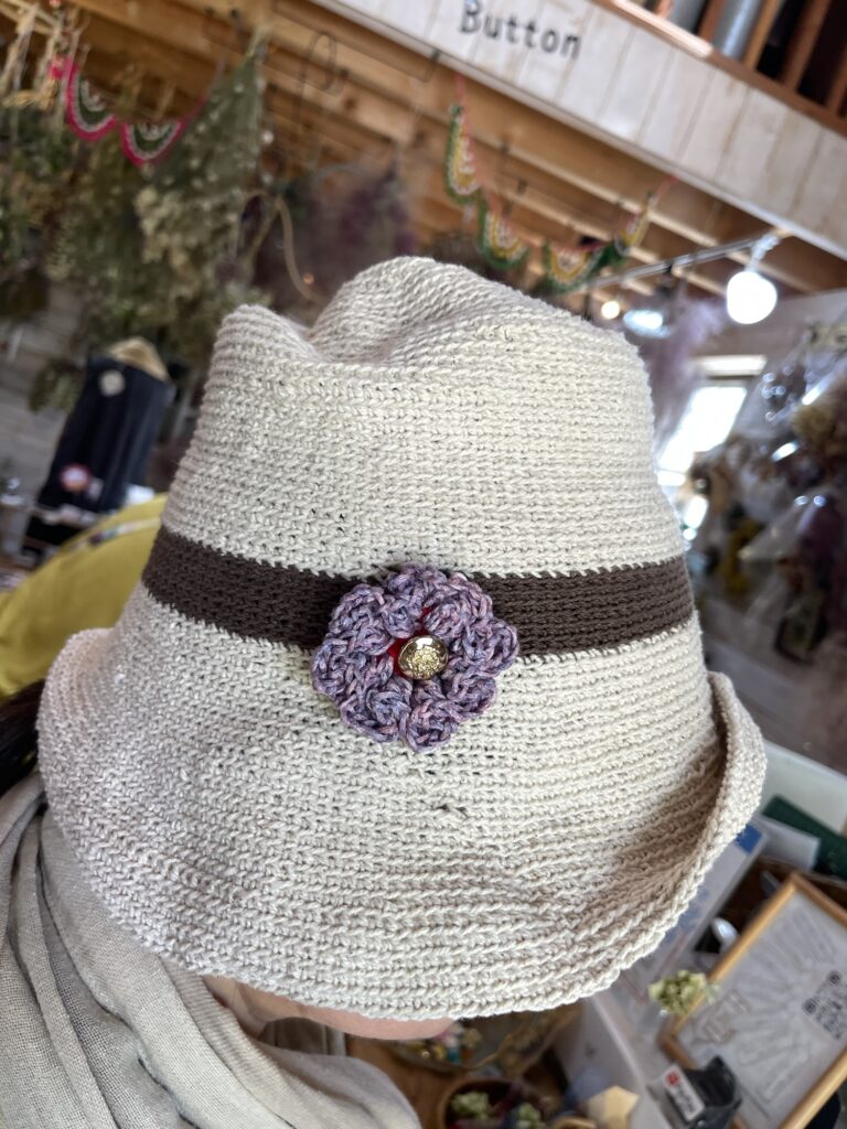 ブラーノザッパのオリジナルコットン糸で編まれたという帽子とコサージュを見せていただきました。たくさんの色があるので組み合わせが効いてとっても可愛い糸です。
