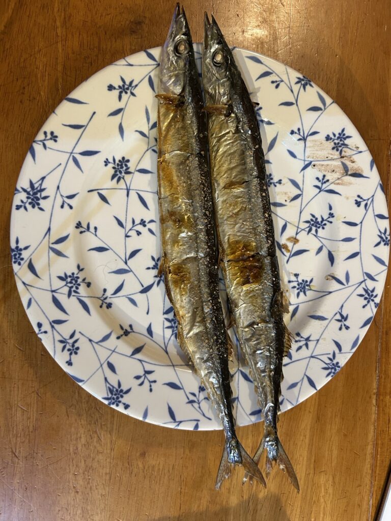 今夜はこーちゃんが焼いてくれたサンマ。