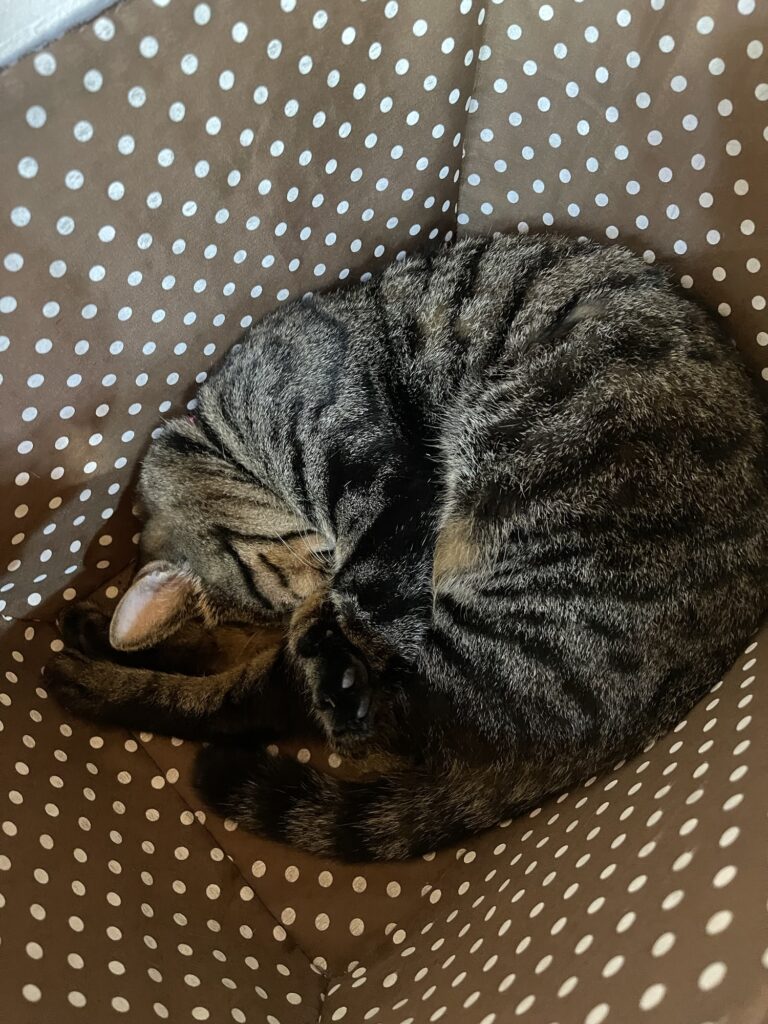 ニャンコはカゴの中で爆睡。気持ちよさそうやなあ。