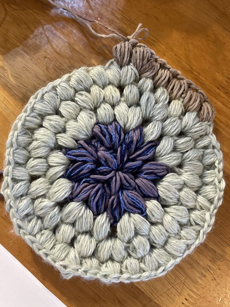 あまり糸ばかりを組み合わせて座布団も編みかけ。たま編みで分厚くしてクッション要らず