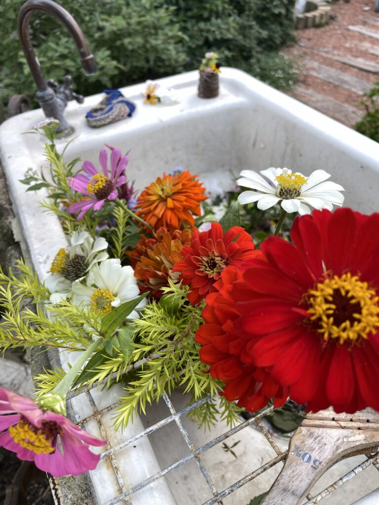 百日草がたくさん咲いていたので切り花にしてカフェに立てましょう。