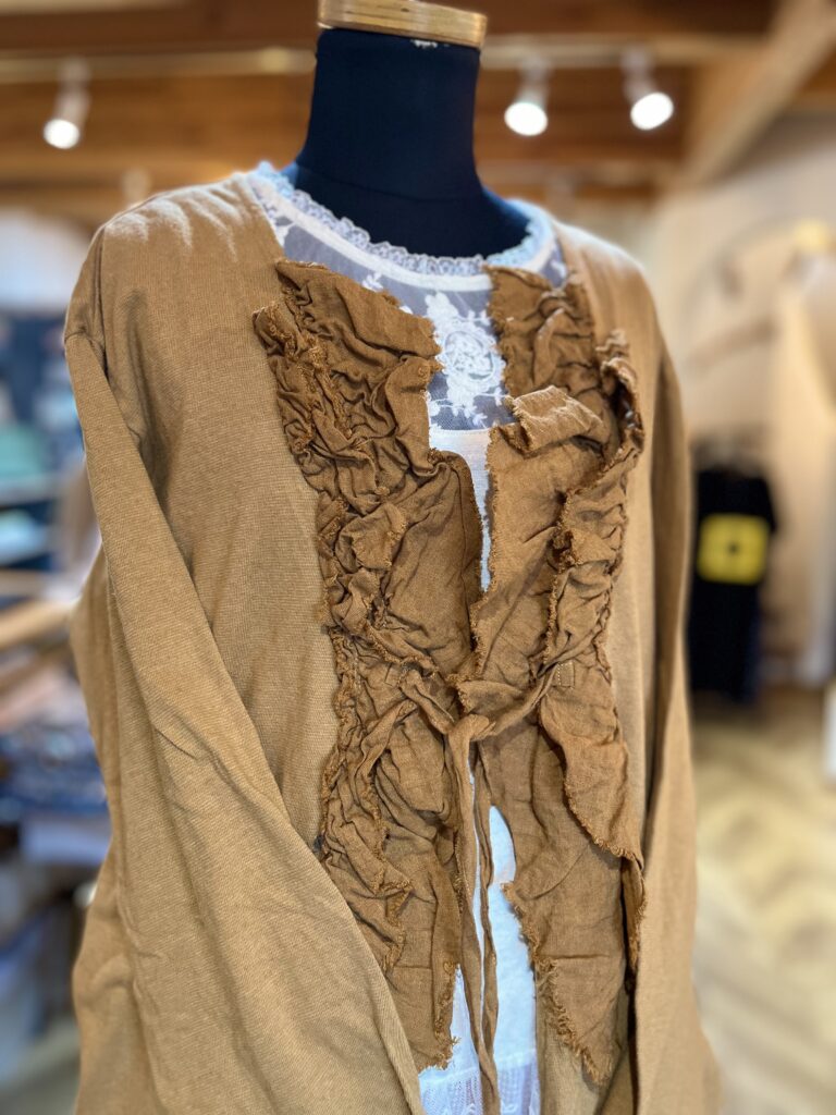 こちらはよく似た感じですが、綿麻の「フリルカーディガン¥9,790」