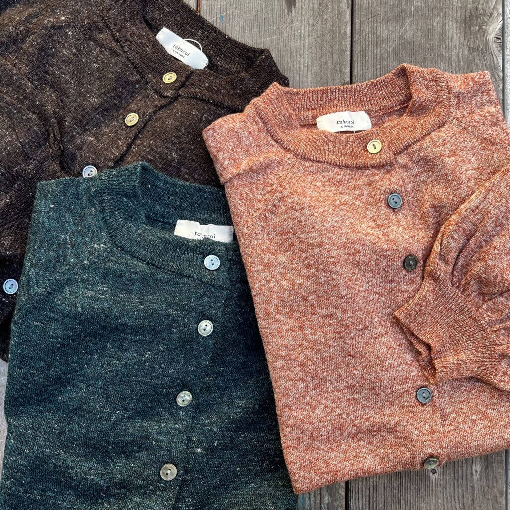 tukuroiからはリネンとウールが少し入ったゆったりラグラン袖のカーディガン¥8,690。