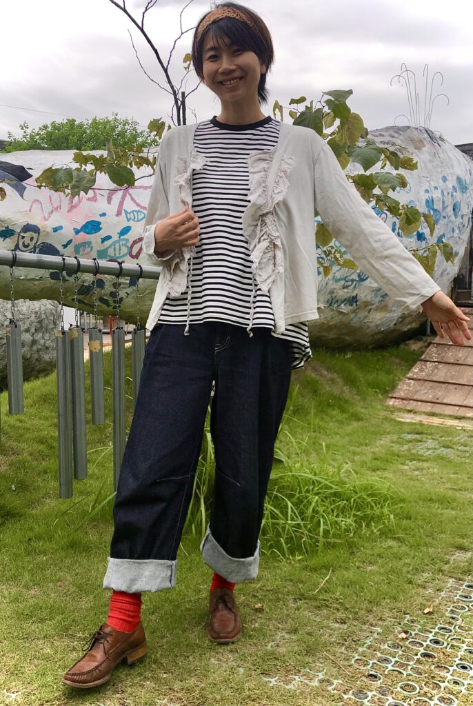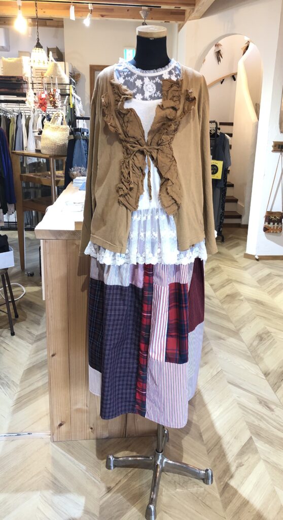 リネンコットンフリルカーディガンと播州織パッチワークスカートを合わせたナチュラルコーデ💐