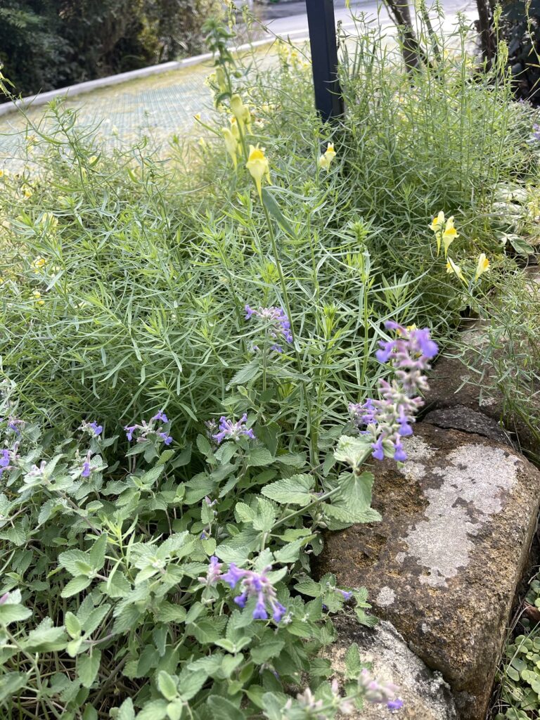 宿根リナリアの黄色と、キャットミントの紫がいいコンビ