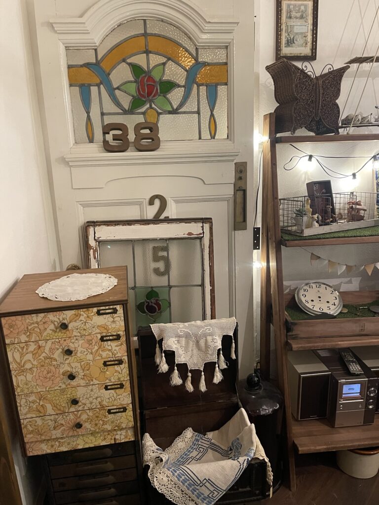 ステンドグラスや子引き出しなど、少しですがアンティークレースもあります。