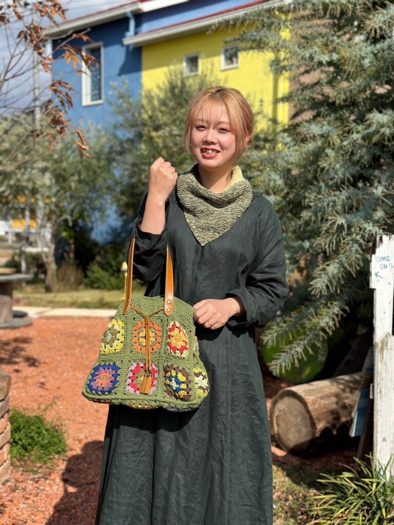 モチーフ編みのバッグは革紐を絞って調節できます。三角ストールも巻き方で表情が変わります。