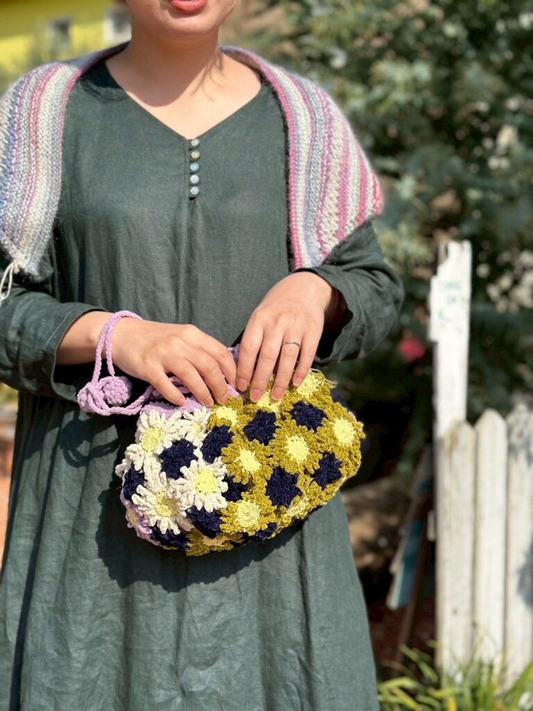 お花の巾着バッグは、紐を長くすると肩にかけることもできます。