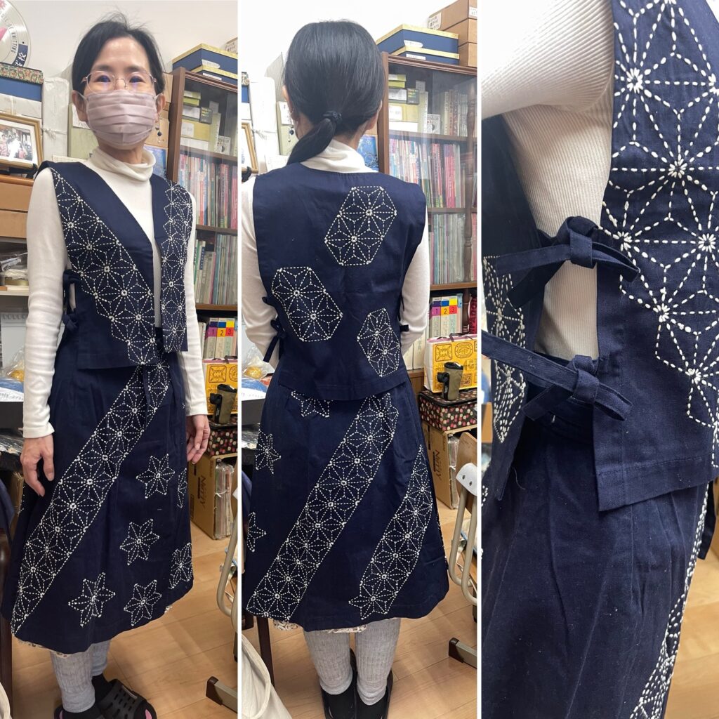 見事な刺し子の巻きスカートと、お揃いのベスト。脇が調節できて、流れるような刺繍が綺麗ですね。これは販売用ではないけど、もし欲しい方があれば販売できるそうです。