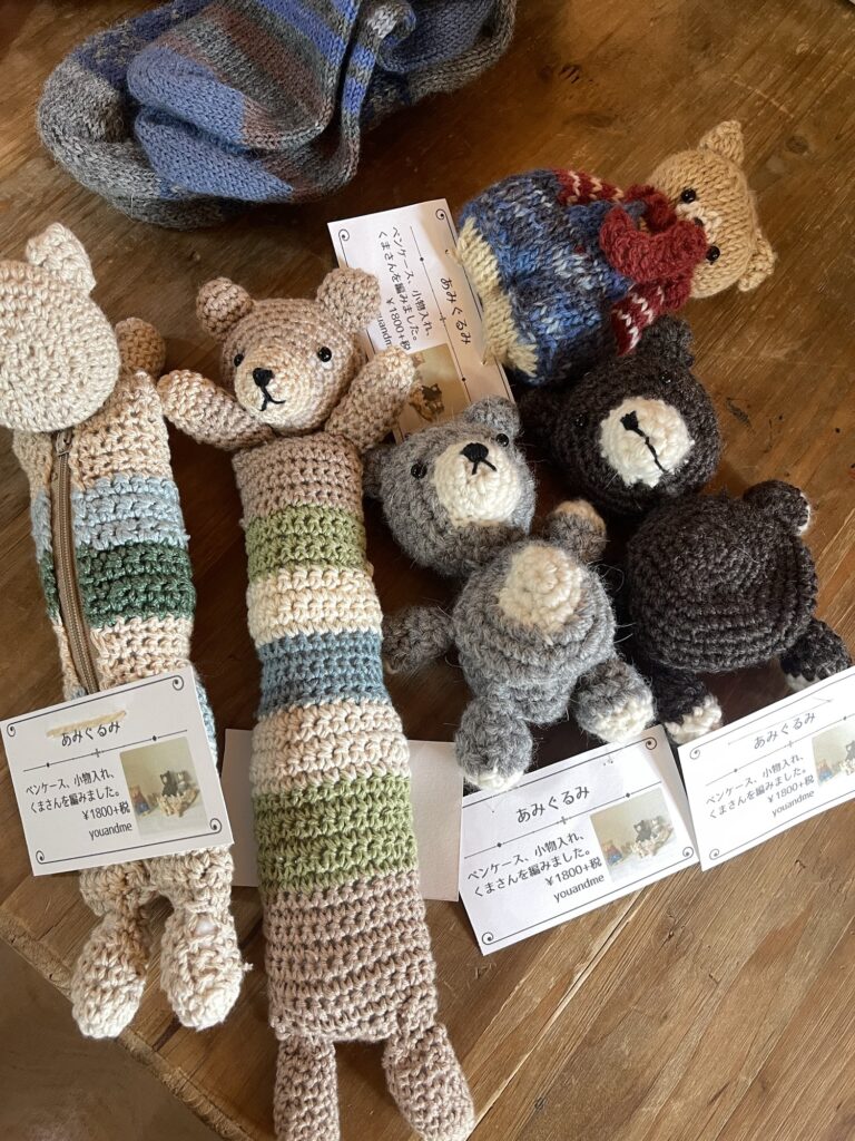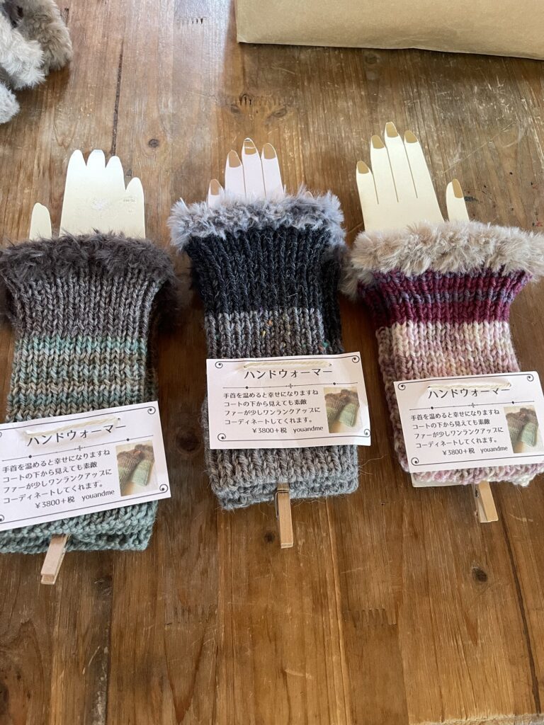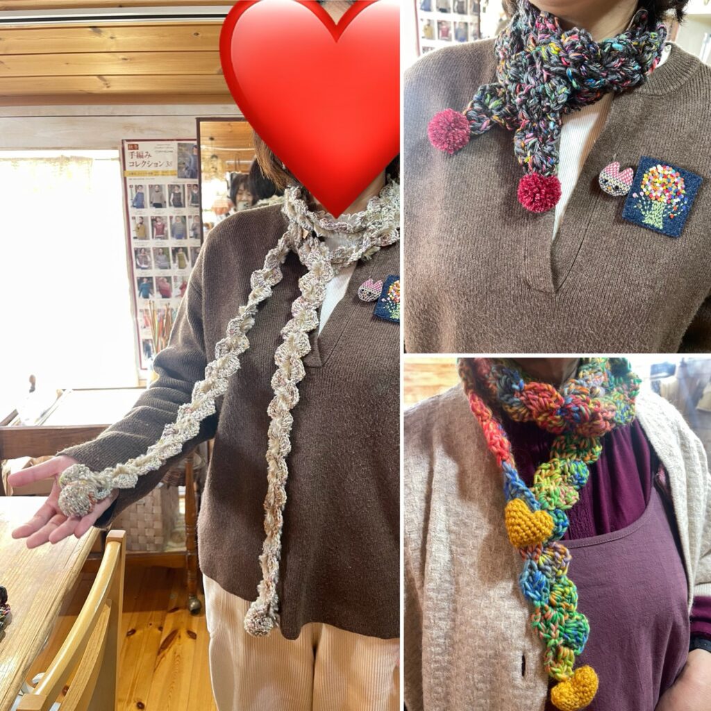 長く巻区と、マスラーみたい。ぐるぐる巻いて短くするのもあったかくてかわいいですよ。ハートのパーツを付けても素敵🩷
