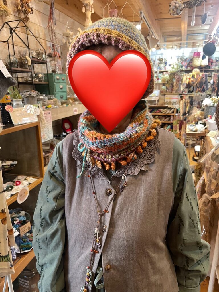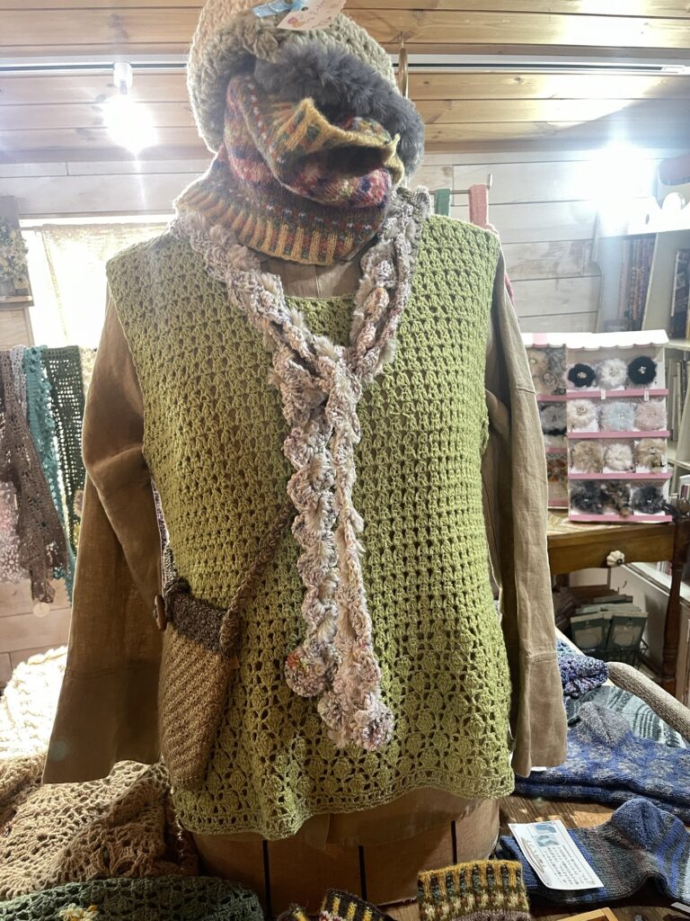 グリーンのかぎ針編みベストにファー付きラリエットと、フェアアイルのスヌード、ニット帽