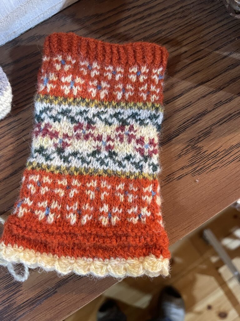 こんなかわいいハンドウォーマーが片方だけ編み上がってました。今回の販売会に間に合えばいいな。