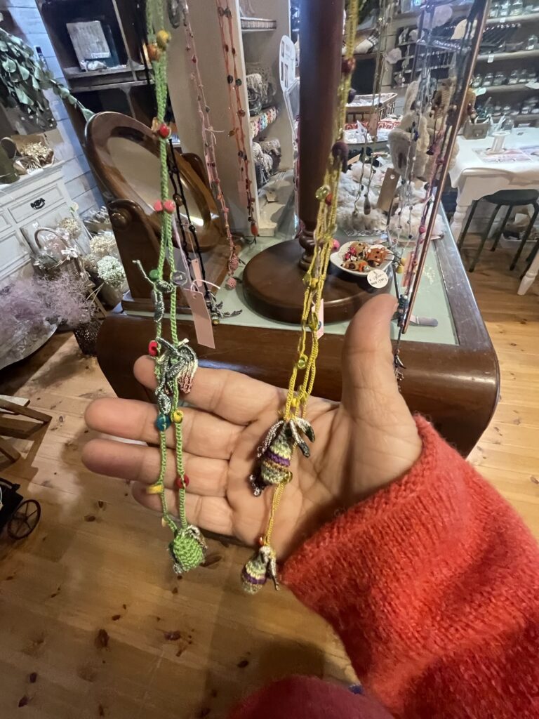 ビーズを編み込んだラリエットも。