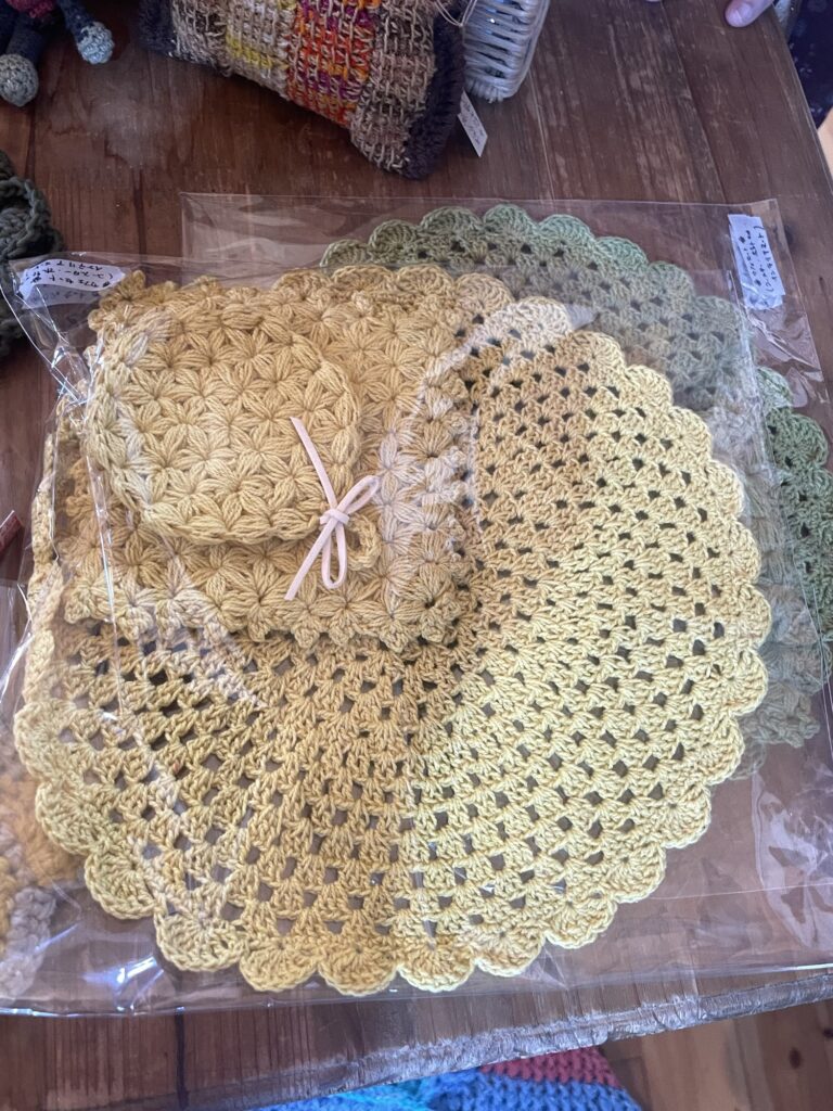 リプ編みのコースターや、ランチョンマットなどのカフェセットはプレゼントにも喜ばれそう。