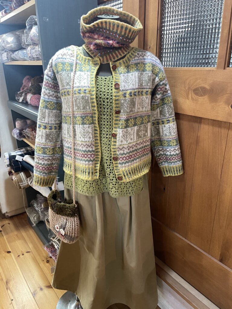 holst ganの糸で編んだグリーンのベストにフェアアイルカーディガンと、スヌードで完璧暖かファッション。小ぶりのバッグを持ってお出かけしたいなあ。