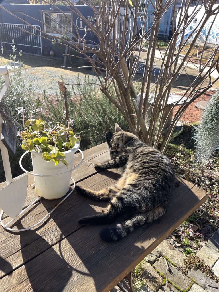 お外のミシン台の上で気持ちよさそうに毛繕いしながら日向ぼっこ。