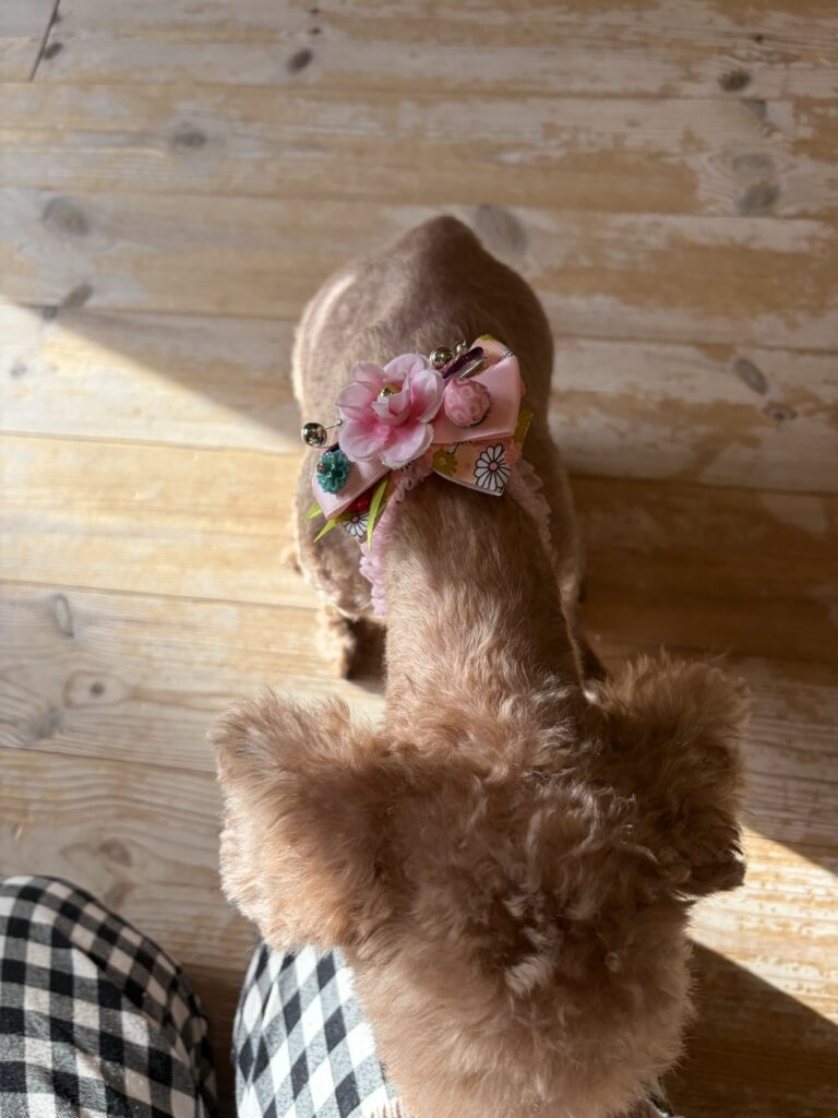 散髪もしてもらってかわいいお正月飾りまで付けてもらってました。