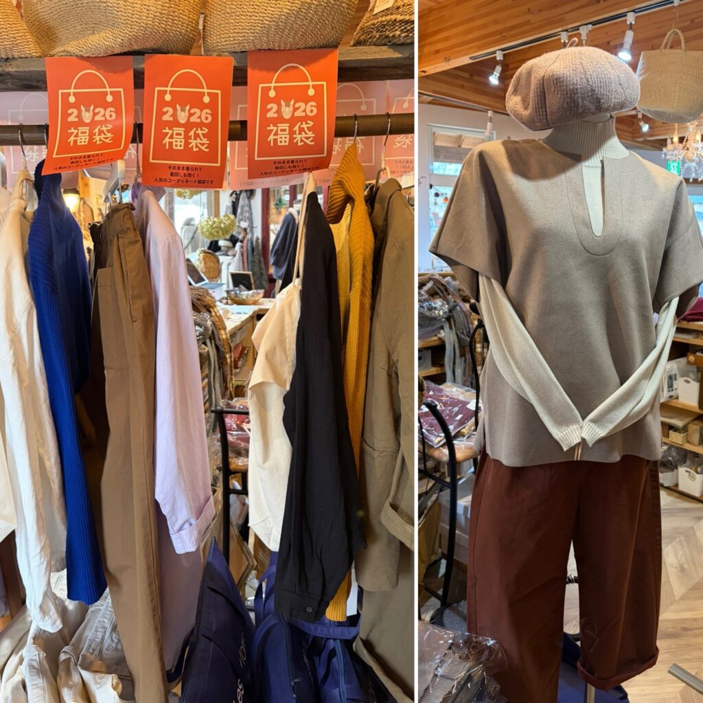胸元の切れ込みがすっきりみえて、高級感のあるトップスに、コーディネートできるアイテムが揃った福袋はとってもお得です