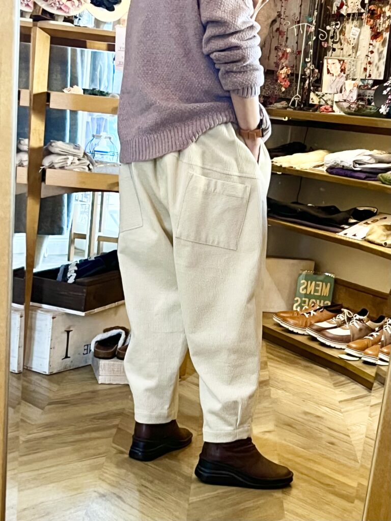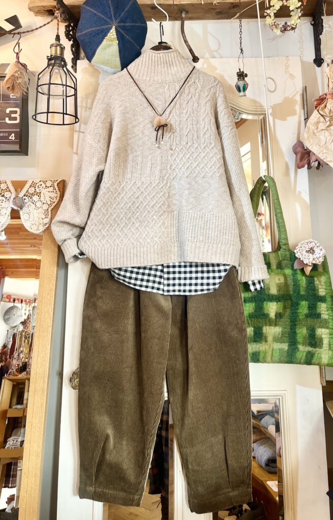 このパネル模様のセーター&コーデュロイパンツのコーデを参考に。。。
