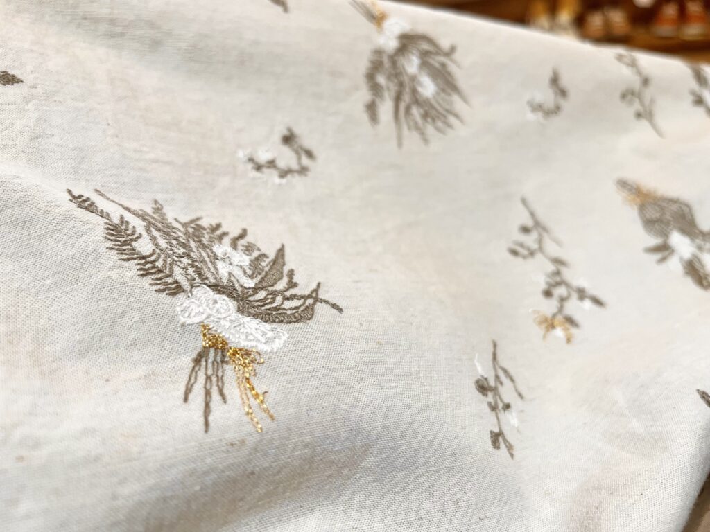 スカートの刺繍をアップで。リボンのとこだけゴールド✨️の糸が、にくいわー。