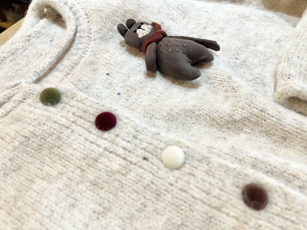 くまちゃんブローチ付き。カラフルなベロア生地のくるみボタンもかわいい!
