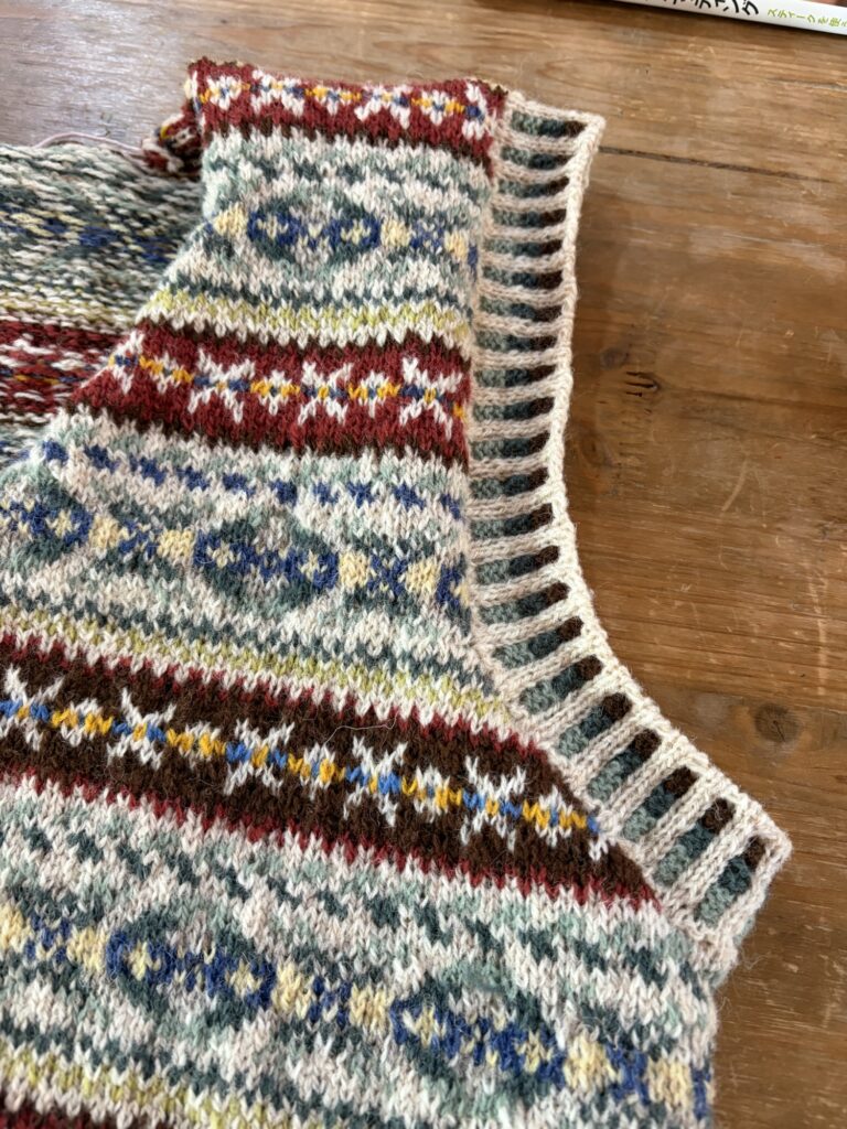 フェアアイルのベストは、切り開き、袖口を編みました。