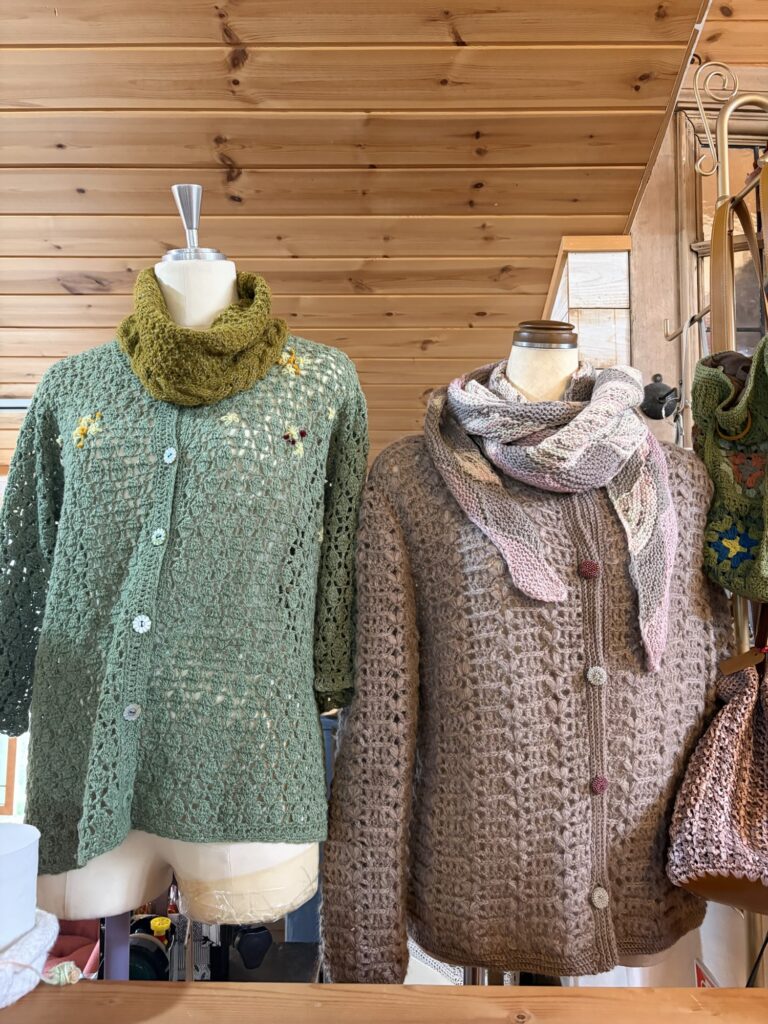 手編みのカーディガンとストール、スヌードの組み合わせ。