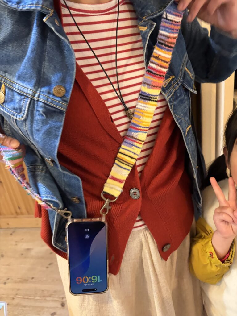 あゆは携帯をよくなくしそうになるので、さおり織のストラップで下げています。