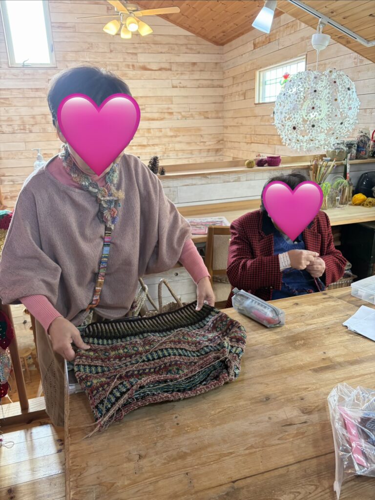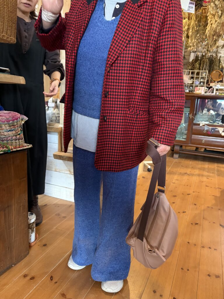 かなり前に機械編みで編んだというブルーのアンサンブル。パンツ素晴らしいです。