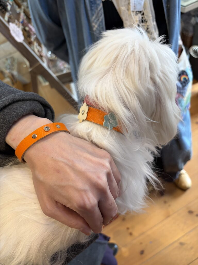 お母さんとお揃いの革の首輪かわいいですね。shipsさんのワークショップで作ったんだって。