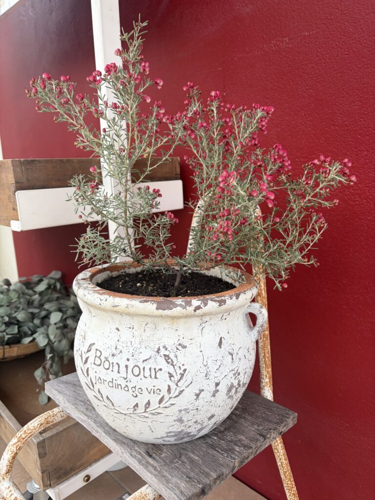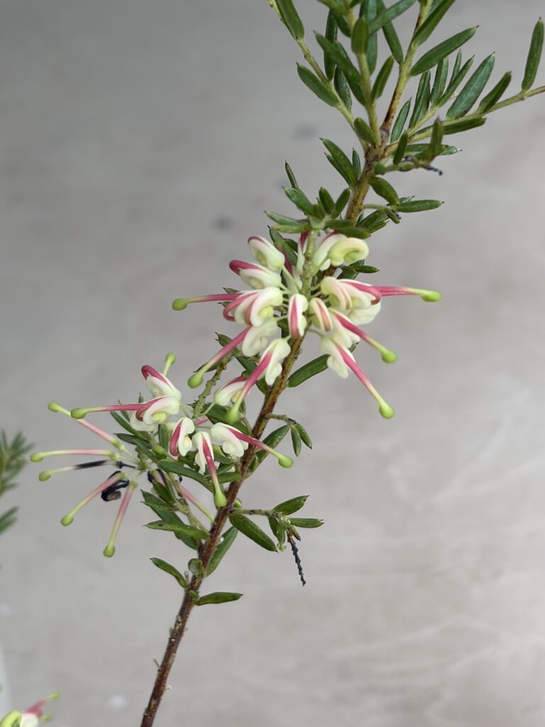 同じグレビレアでも、小ぶりで赤い丸まったようなお花がかわいいタイプ。