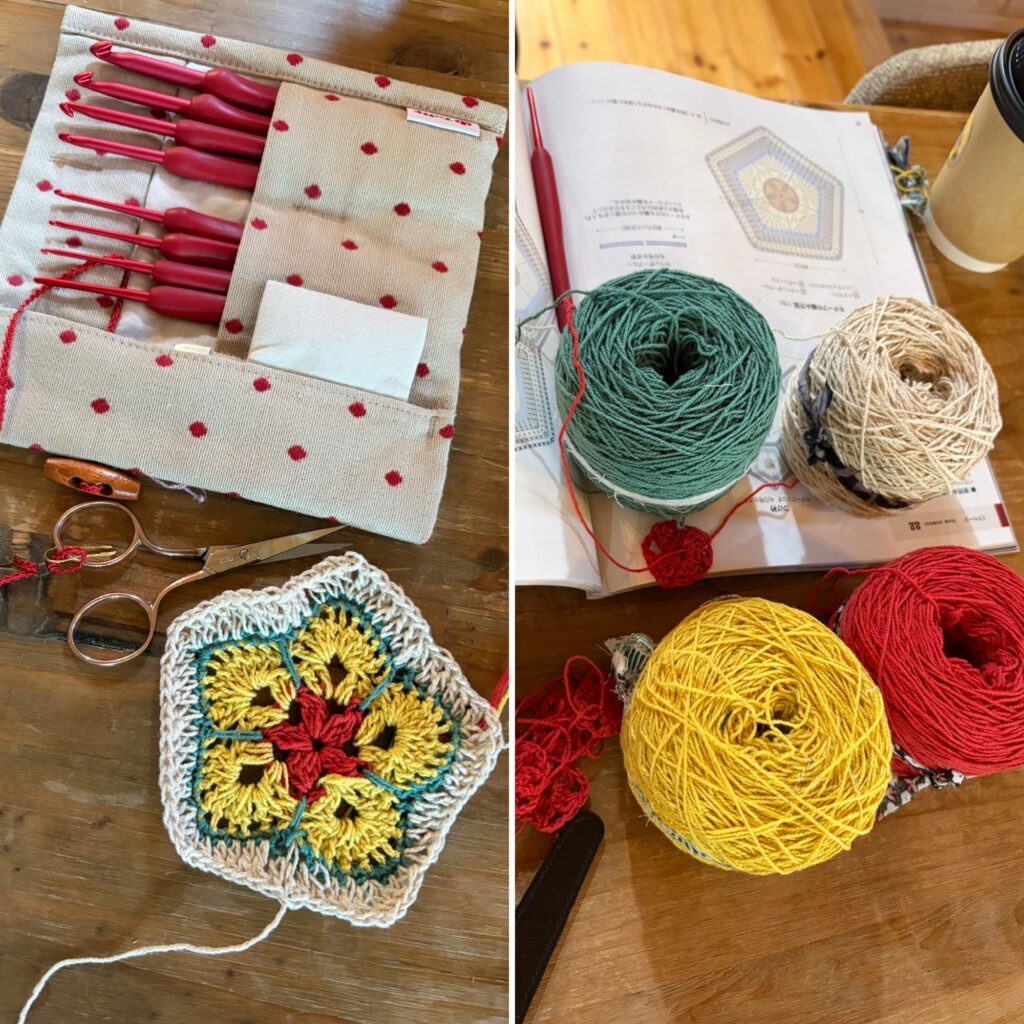 今日は初めての方も2組参加してくださって、モチーフ編みやストールを編んでくださいました。