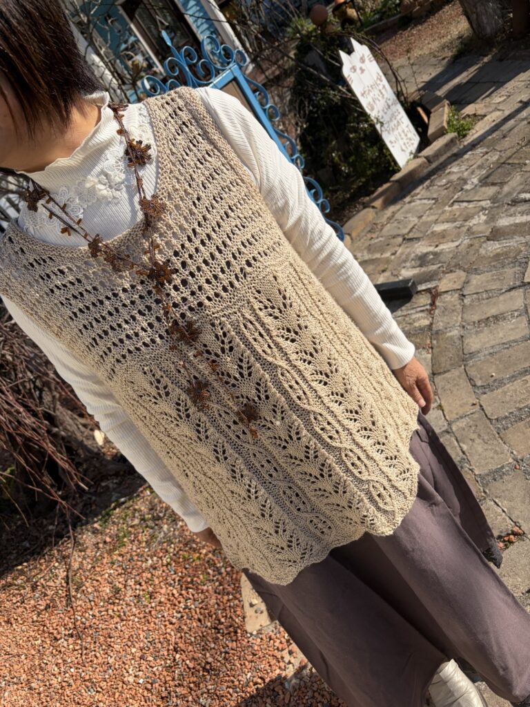 ザッパの日に買った、レース付きカットソーに、ブラウンのザッパワンピ。棒針編みのベストは後ろがかなり長く、背中割れ。