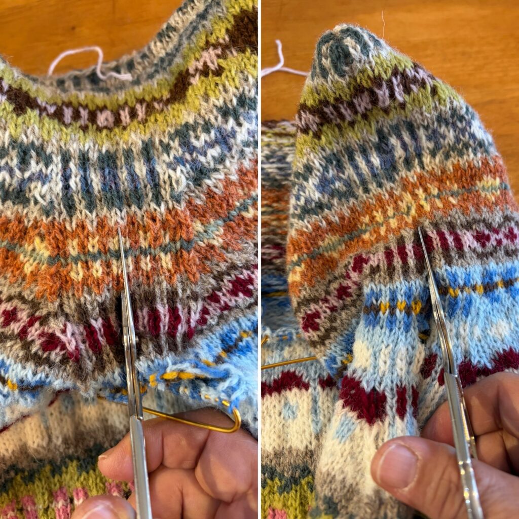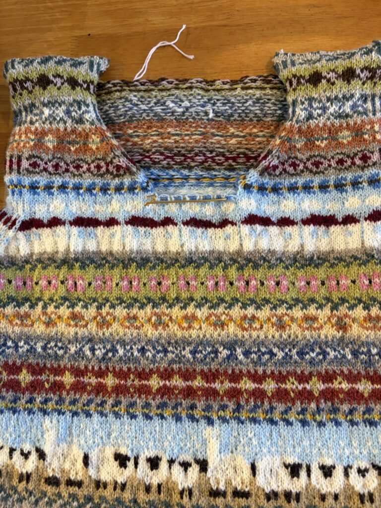 フェアアイルのベスト、肩まで編めて、繋ぐとヘンテコな形。でも真ん中のスティークを切り開くとちゃんとした形になるんです。