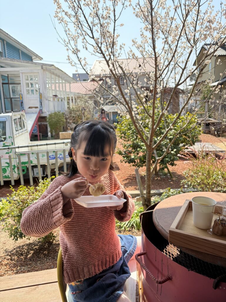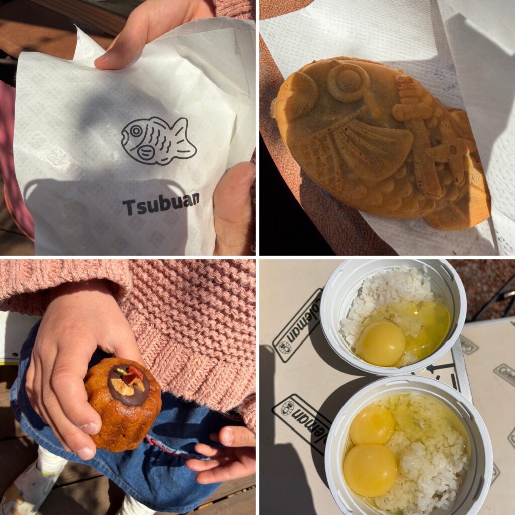 卵かけご飯は、割ってみたら2つ入っていました。ご飯似合うおかずもいろいろ買って、うーちゃんや編み編みのみんなと、綿小屋のデッキで食べました。