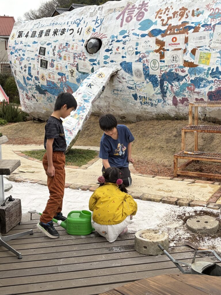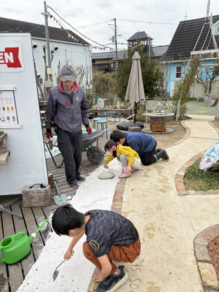 みんなで何をしてるのかと思ったら、残った土壌改良剤を道に敷いて、石臼を埋め込んでました。子供達もこんなことは張り切って手伝ってくれます。3人で楽しそうにペタペタしてましたよ。