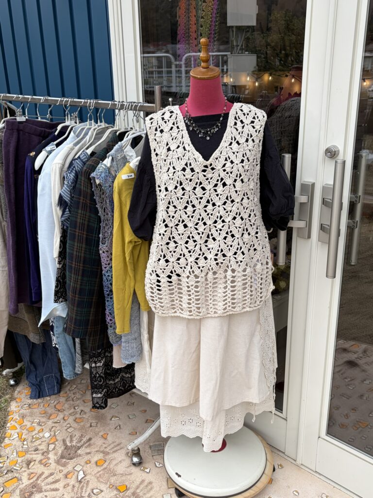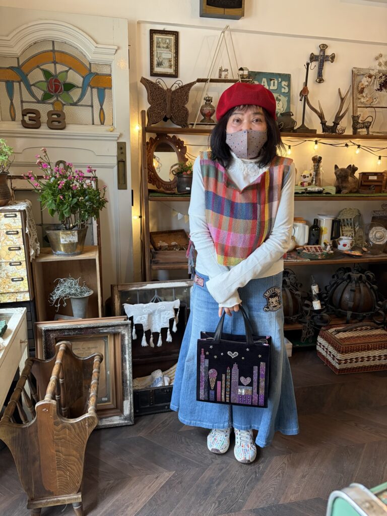 白い首元レース付きのカットソーは私も買いました。さおり織のベスト似合ってますね〜!赤いベレー帽とデニムですごく似合ってます。短めベストはバランス良くてスッキリ見えますね。