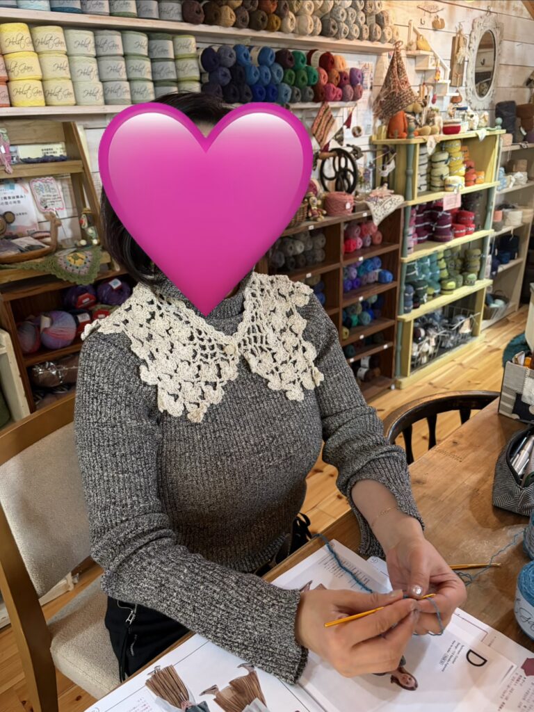 初めて編まれたお花の付け襟。