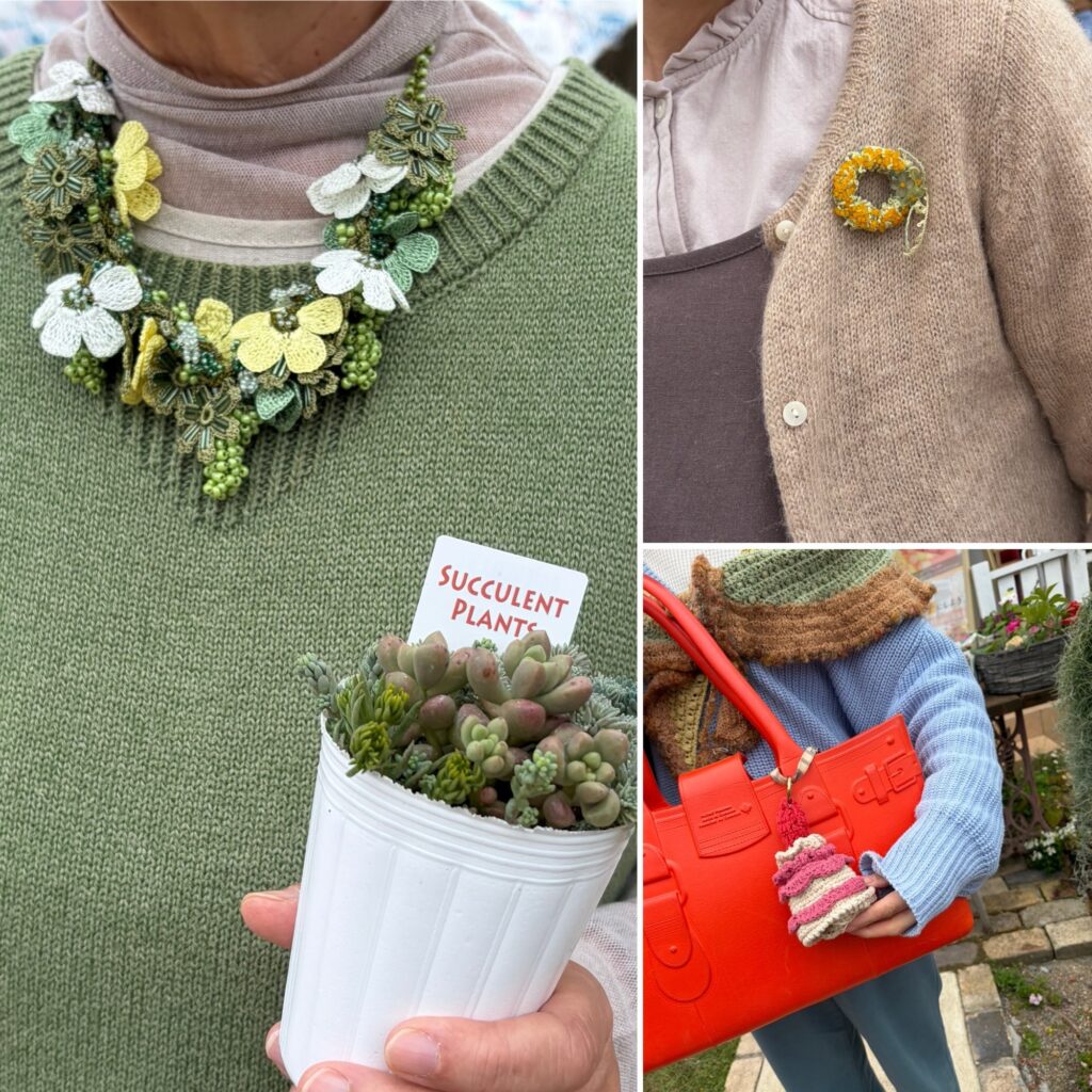 緑のジャラジャラオヤに、多肉、ミモザブローチ、編み上がったばかりのケーキを赤いバッグに。