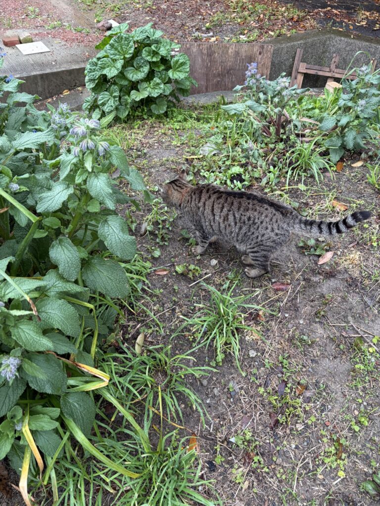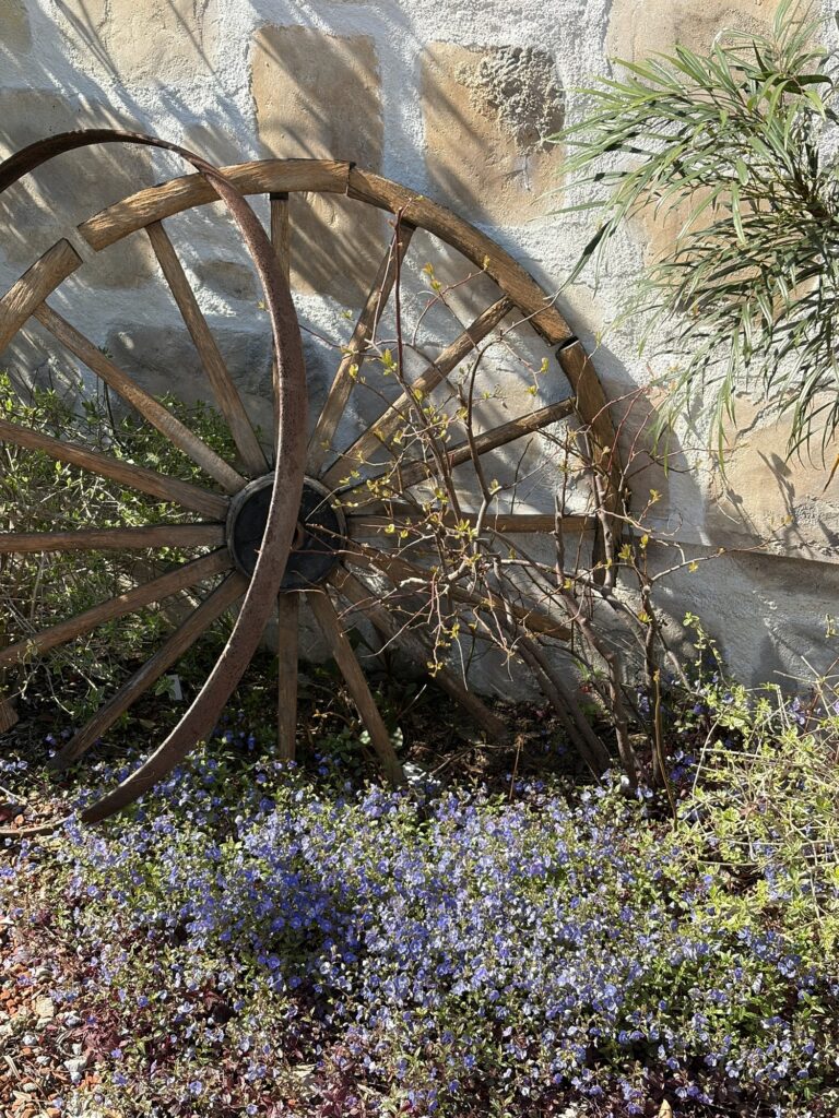 ブルーの小さな花オックスフォードベロニカが、車輪の足元で群生。